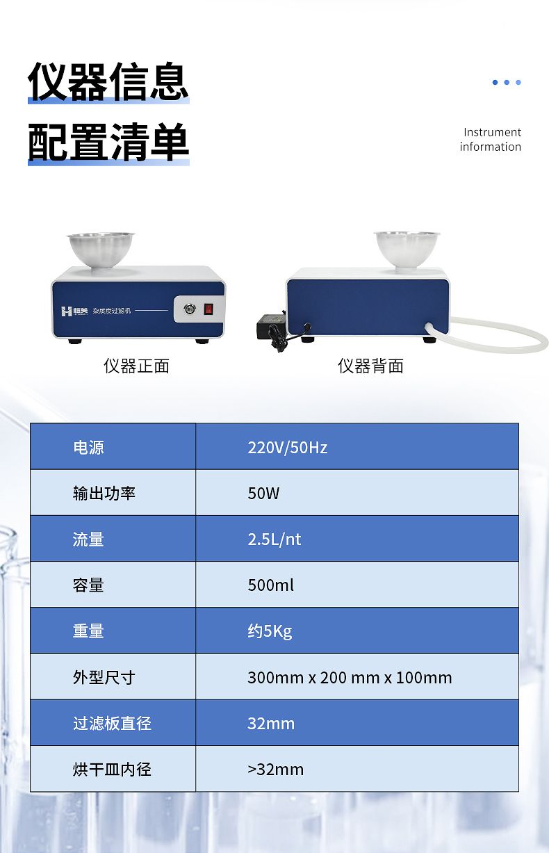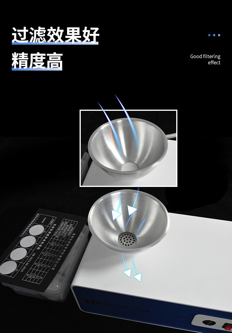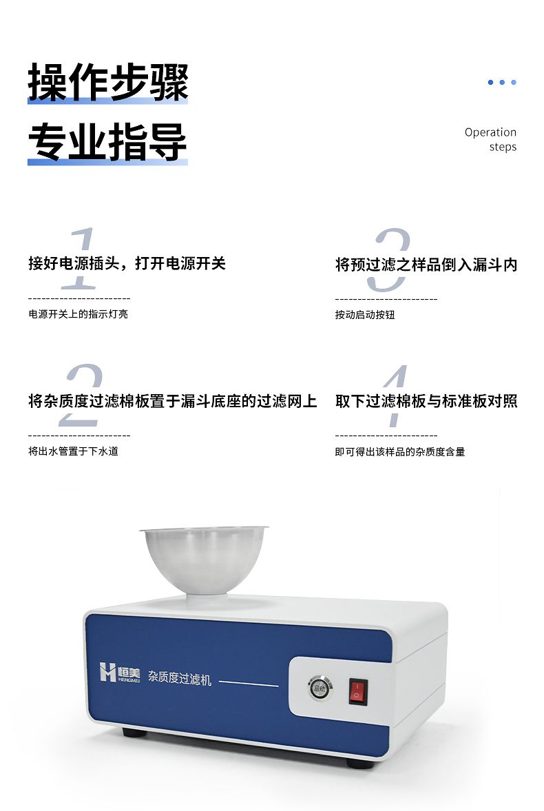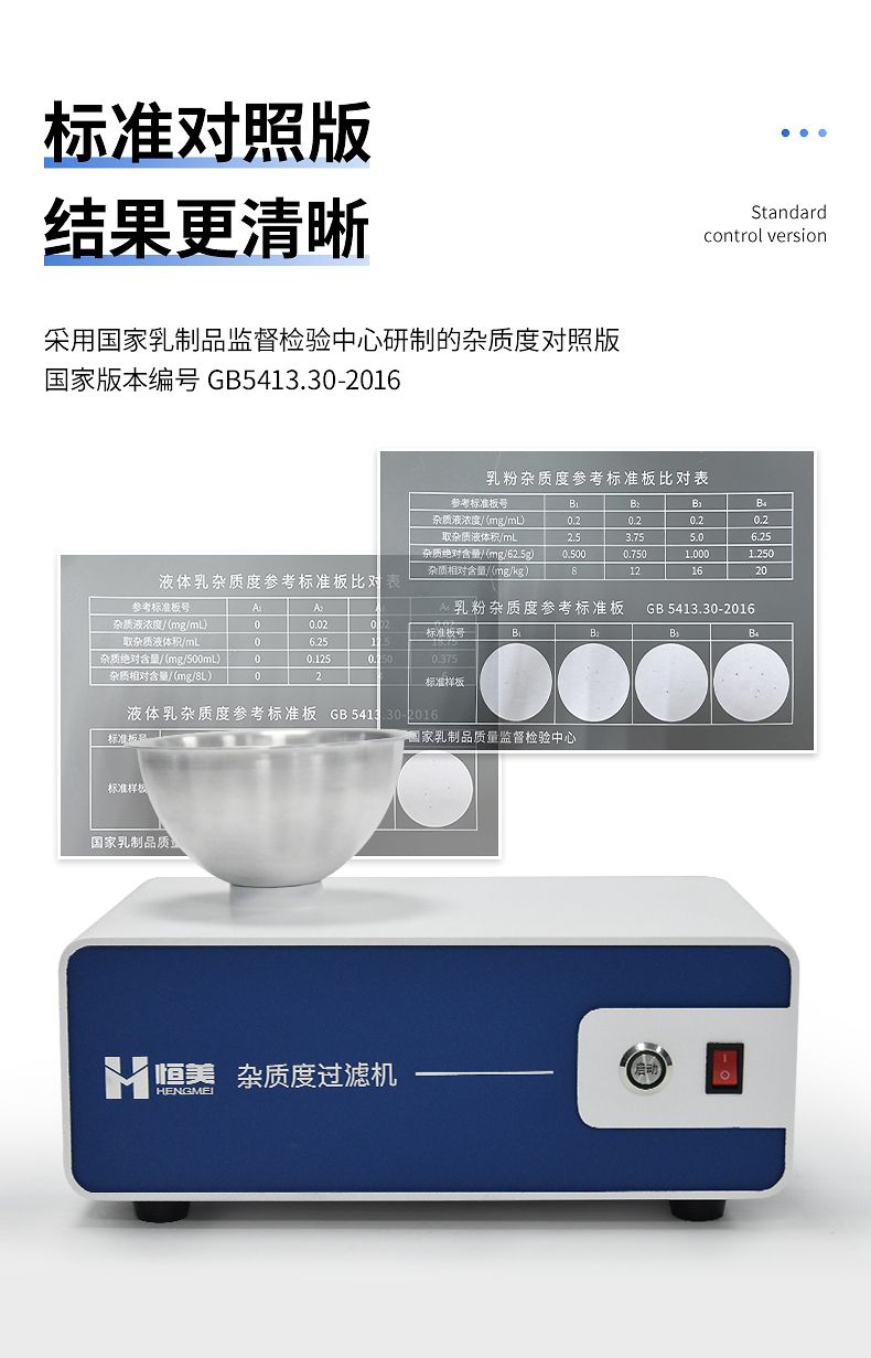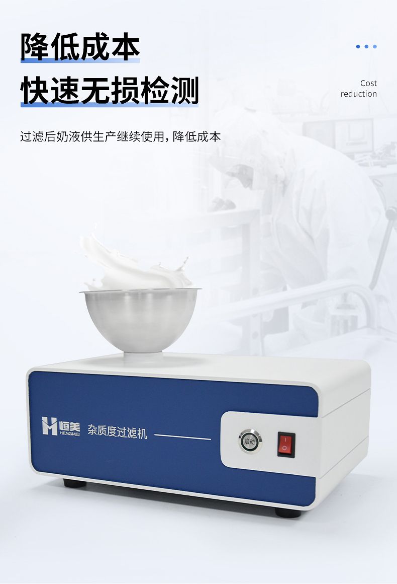HM-ZZ杂质度过滤机杂质度过滤机是山东恒美电子科技有限公司按照国家标准《乳、乳制品的检验方法》中关于杂质度的测定而专门制造。此仪器是在一代杂质过滤机,二代杂质过滤机的基础上依据研发生产的近三代杂质度过滤机。杂质度过滤机避免了机械式过滤机皮带维护麻烦,耗材贵的麻烦。原有基础上改进电机,并按新标准进行改动,更好的满足了要求,更耐用,免维护,并配。解决了1代产品恼人的噪音使用更加持久耐用,并配配了全部使用配件,更全,更方便使用。