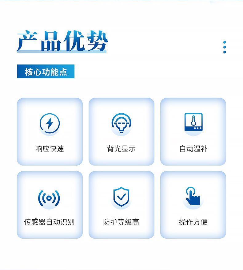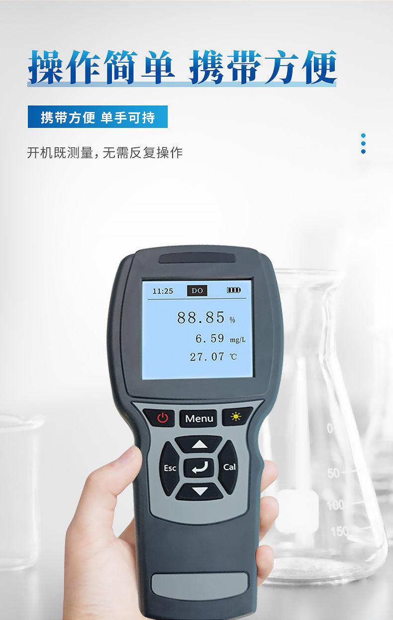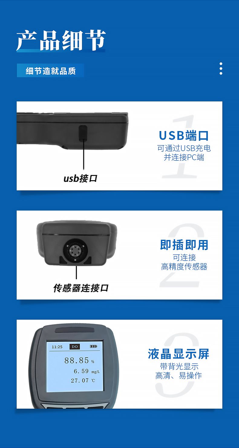带背光显示和操作键盘,功能全面操作简单,界面简洁,溶解氧光学传感器自动识别,测量数据的读取、存储,传感器校准等功能,并且可以USB数据导出,实现更多高端功能。追求高性价比是我们一贯的追求。
