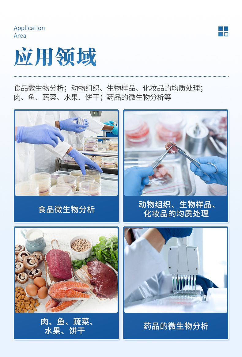 拍打式无菌均质机应用领域:食品微生物分析;动物组织、生物样品、化妆品的均质处理;肉、鱼、蔬菜、水果、饼干;药品的微生物分析等;