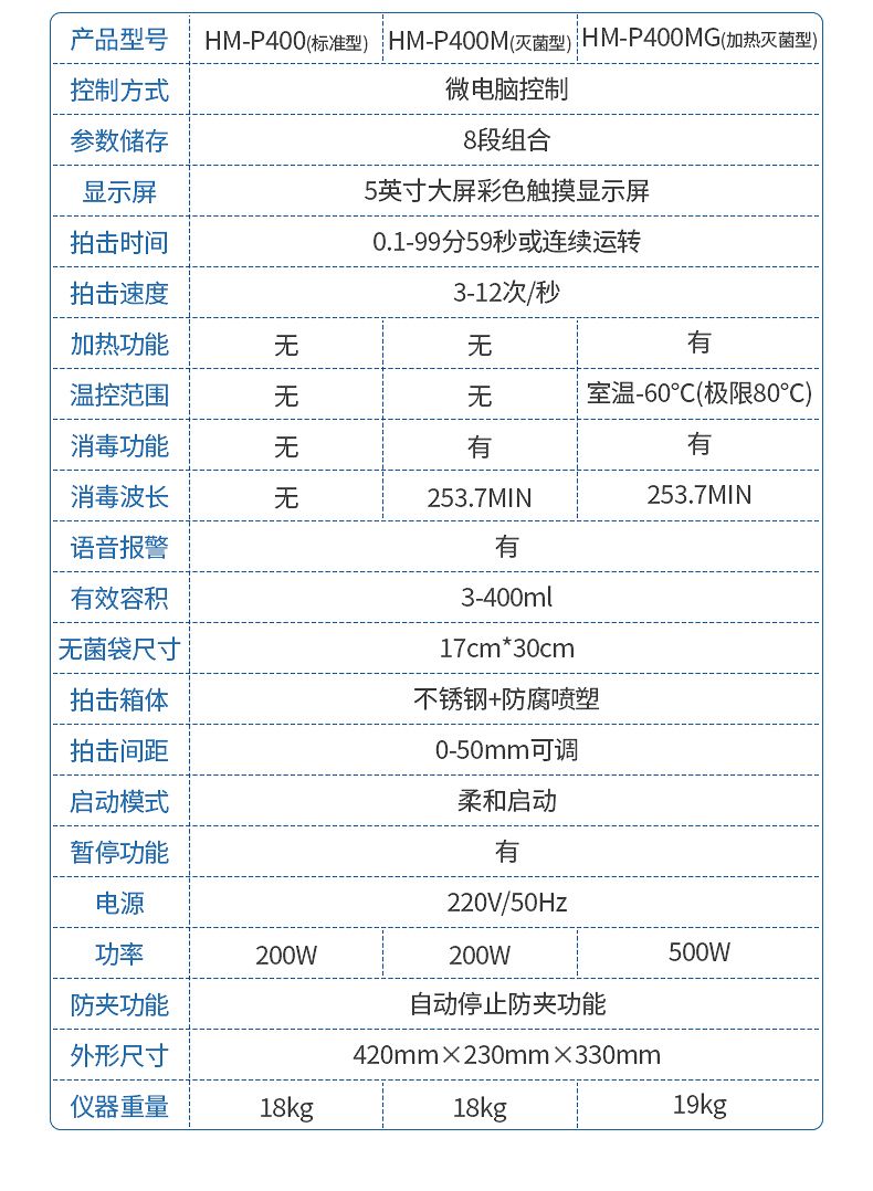 产品型号 P400 P400M P400MG 控制方式 微电脑控制 参数储存 8段组合 显示屏 大屏彩色触摸显示屏 拍击时间 0.1-99分59秒或连续运转 拍击速度 3-12次/秒 加热功能 无 无 有 温控范围 无 无 室温-60℃(极限80℃) 消毒功能 无 有 有 消毒波长 无 253.7MIN 253.7MIN 语音报警 有 有效容积 3-400ml 无菌袋尺寸 17cm*30cm 拍击箱体 不锈钢+防腐喷塑 拍击间距 0-50mm可调 启动模式 柔和启动 暂停功能 有 电源 220V/50Hz 功率 200W 200W 500W 防夹功能 自动停止防夹功能 外形尺寸 420*230*330mm 仪器重量 18kg 18kg 19kg -