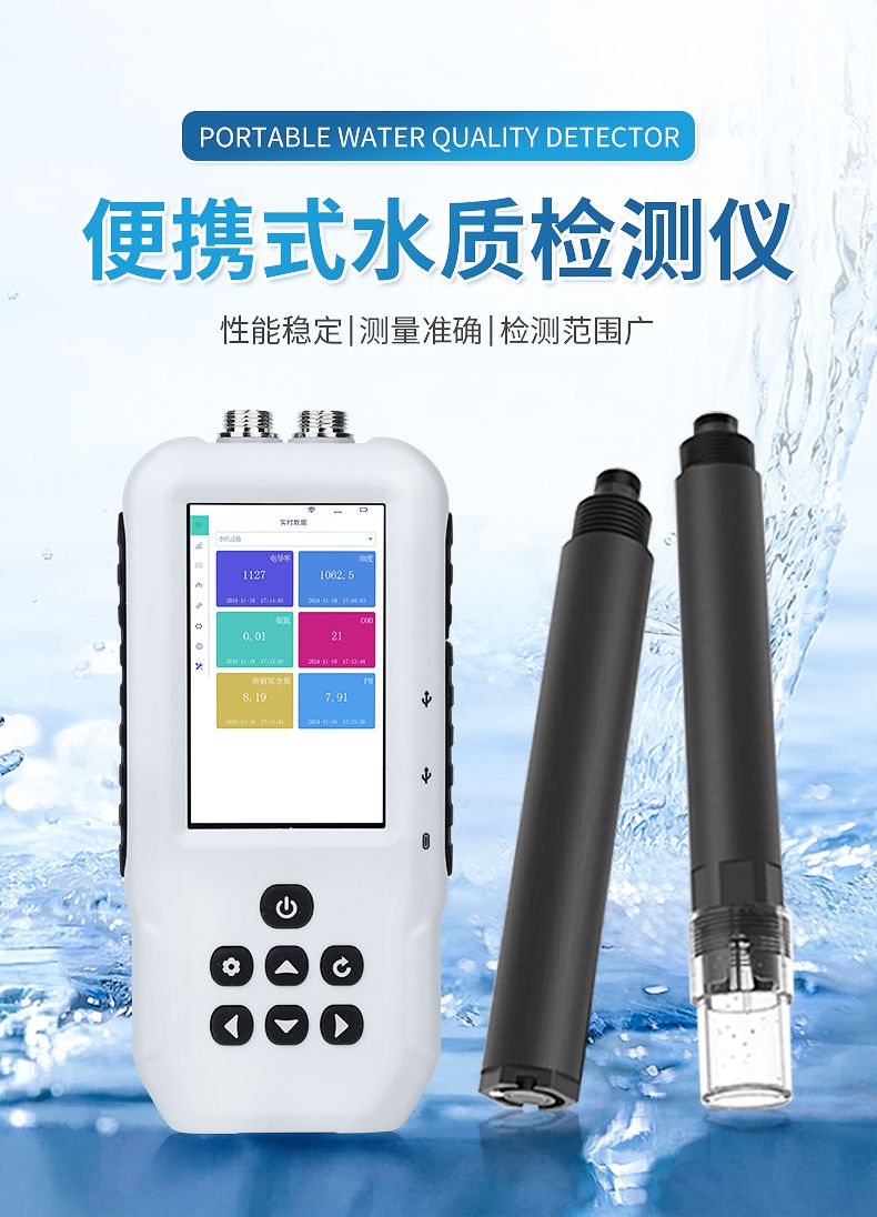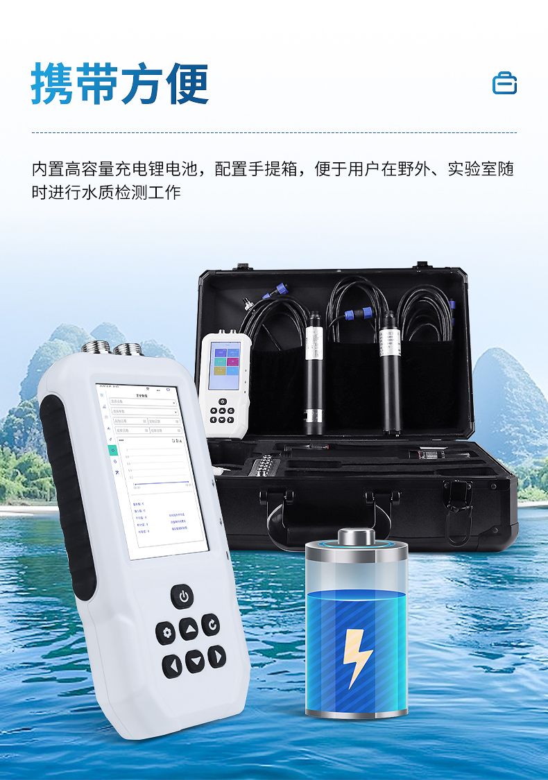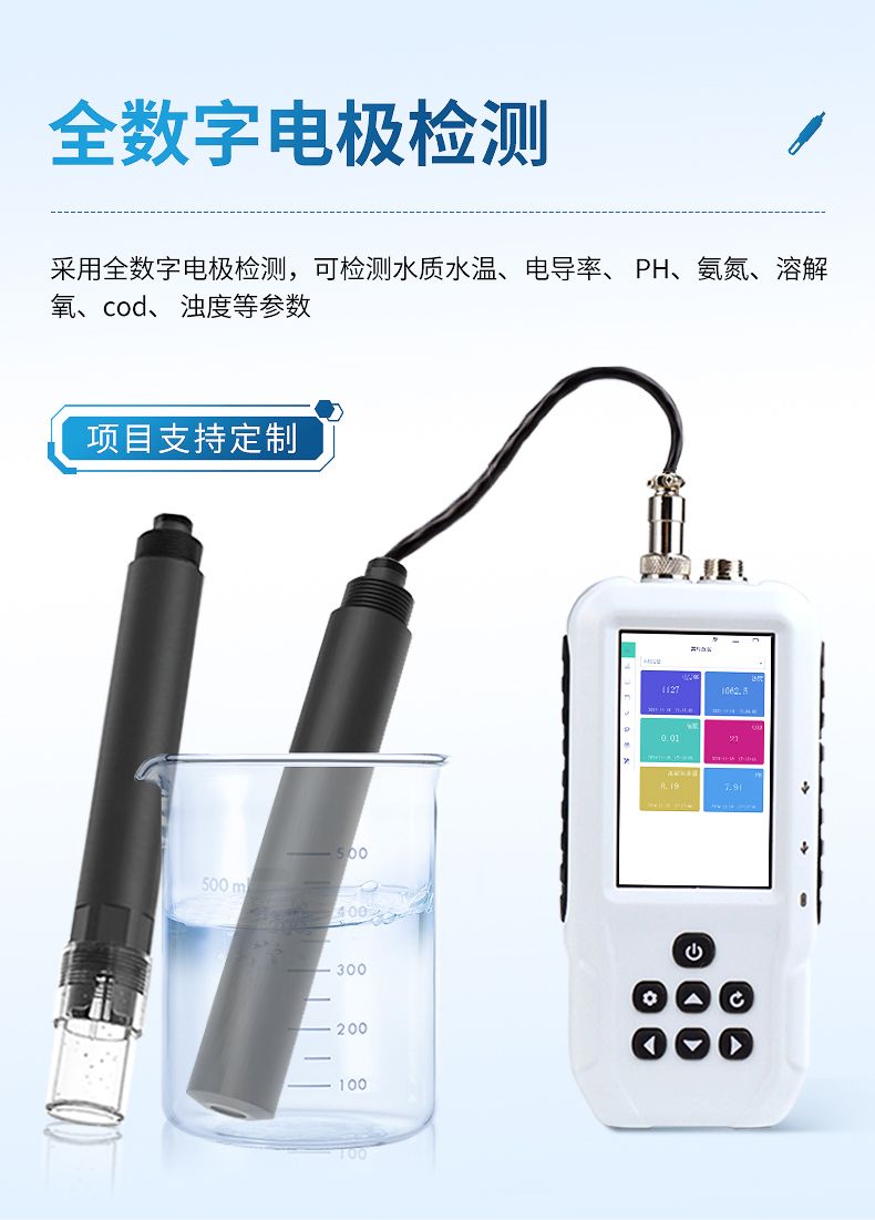 便携式多参数水质检测仪是一款电极法水质分析仪器,采用全数字电极检测,可检测水质水温、电导率、PH、氨氮、溶解氧、cod、浊度参数。仪器搭载自研ftiot操作系统,操作简单、性能稳定、测量准确、检测范围广,内置高容量充电锂电池,便于用户在野外、实验室随时进行水质检测工作。