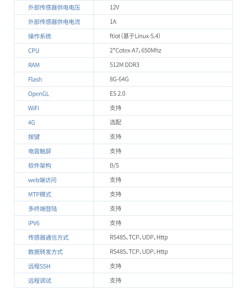 充电输入电压 4.5V-5.5V 充电电流 <2A 屏幕尺寸 3.5寸 屏幕分辨率 480*800 ☆ 屏幕接口 MIPI DSI ☆ USB接口 2(支持外扩鼠标、键盘、4G等) ☆ Type-C 1(支持外扩鼠标、键盘、4G等) ☆ RS485 2(支持Modbus、json、asc输入等) 外部传感器供电电压 12V 外部传感器供电电流 1A 操作系统 ftiot(基于Linux-5.4) ☆ CPU 2*Cotex-A7,650Mhz ☆ RAM 512M DDR3 ☆ Flash 8G-64G OpenGL ES 2.0 ☆ Wifi 支持 4G 选配 按键 支持 电容触屏 支持 软件架构 B/S ☆ web端访问 支持 ☆ MTP模式 支持 ☆ 多终端登陆 支持 ☆ IPV6 支持 ☆ 传感器通信方式 RS485、TCP、UDP、Http ☆ 数据转发方式 RS485、TCP、UDP、Http ☆ 远程SSH 支持 ☆ 远程调试 支持 ☆ 三 、传感器参数及配置
