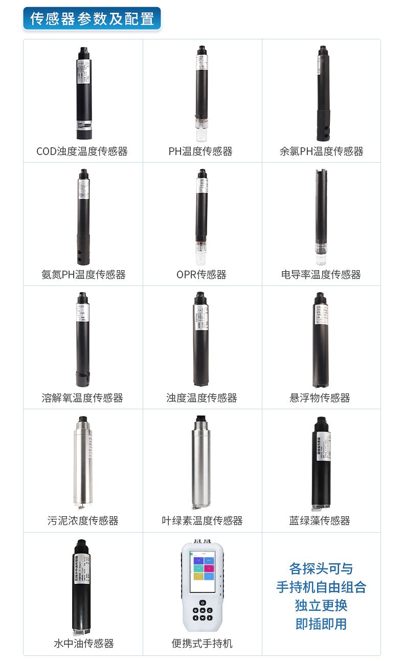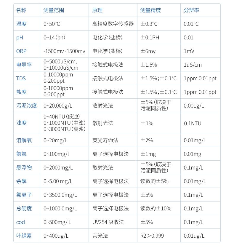 序号 名称 测量范围 原理 测量精度 分辨率 配置 备注 1 温度 0~50℃ 高精度数字传感器 ±0.3℃ 0.01℃ ✔ 2 pH 0~14(ph) 电化学(盐桥) ± 0.1PH 0.01 ✔ 3 ORP -1500mv~1500mv 电化学(盐桥) ± 6mv 1mV 4 电导率 0~5000uS/cm,0~10000uS/cm 接触式电极法 ± 1.5% 1uS/cm ✔ 5 TDS 0-10000ppm 0-200ppt 接触式电极法 ±1.5%;±0.1°C 1ppm 0.01ppt 6 盐度 0-10000ppm 0-200ppt 接触式电极法 ±1.5%;±0.1°C 1ppm 0.01ppt 7 污泥浓度 0~20.000g/L 散射光法 ±5%(取决于污泥同质性) 0.001g/L 8 浊度 0~40NTU(低浊) 散射光法 ± 1% 0.1NTU 可选配 0~1000NTU(中浊) 散射光法 ± 1% 0~3000NTU(高浊) 散射光法 ± 1% ✔ 9 溶解氧 0~20mg/L 荧光寿命法 ± 2% 0.01mg/L ✔ 10 氨氮 0~100mg/l 离子选择电极法 ±1mg 0.01mg ✔ 11 悬浮物 0~2000mg/L 散射光法 ±5%(取决于污泥同质性) 0.1mg/L 12 余氯 0~5.00 mg/L 离子选择电极法 读数的±5% 0.01mg/L 流速0.42m/s-0.85m/s时精度*佳 13 氯离子 0-3500.0mg/L 离子选择电极法 ±5% 0.1mg/L 14 总硬度 0~1000.0mg/L 离子选择电极法 读数的±10% 0.1mg/L 15 cod 0~500mg/ L UV254 吸收法 ±5% 0.1mg/L ✔ COD与叶绿素带有自动清洁器,可防止生物附着,避免光窗污染,以保证长期监测依然具有稳定性;可设置自动清洁时间及清洁次数,功耗0.7W 16 叶绿素 0~400ug/L 荧光法 R2>0.999 0.01ug/L -