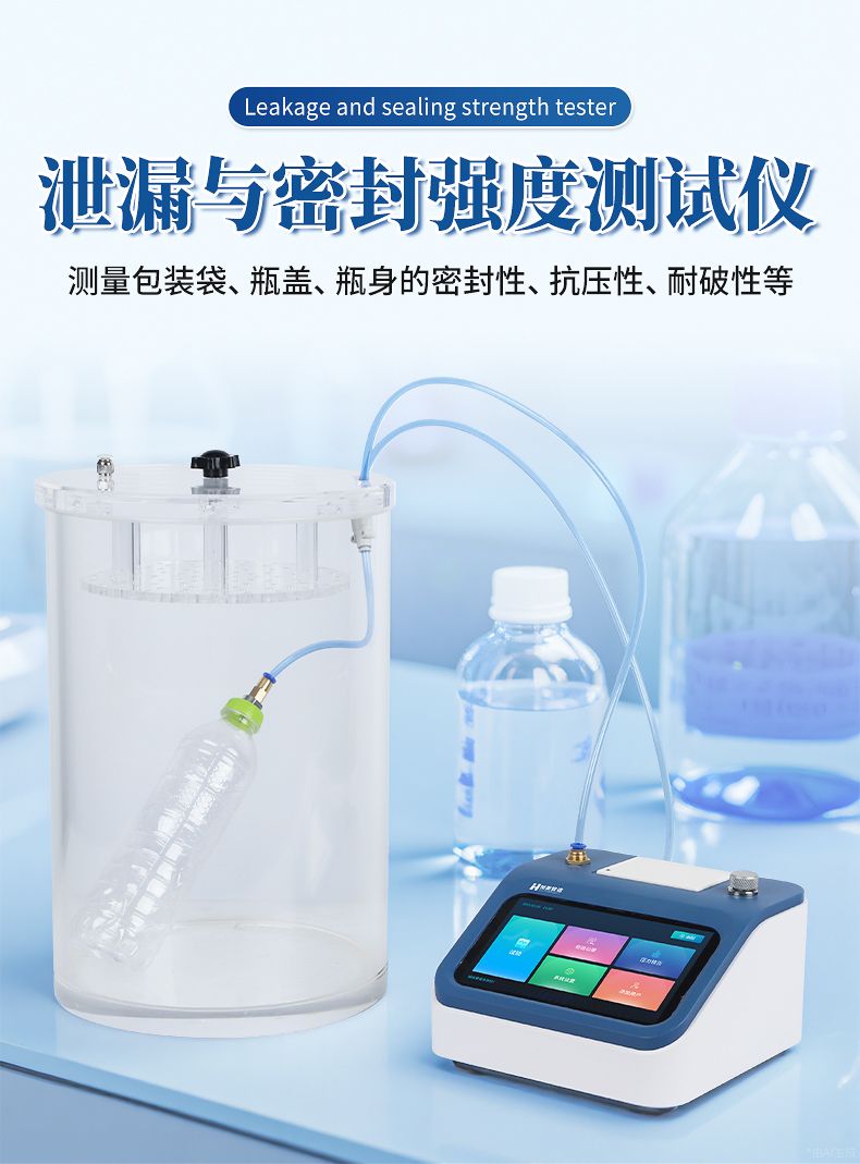 泄漏与密封强度测试仪,适用于各种热封、粘接工艺形成的软包装件、无菌包装件等各封边的封口强度、热封质量、以及整袋胀破压力、密封泄漏性能的量化测定;对软包装袋所使用材料的抗压强度、耐破强度等指标分析;各种塑料防盗瓶盖密封性能、瓶盖连接脱扣强度、材料的应力强度的量化测定;瓶体密封性、抗压性、耐破性等评估分析。通过正压法来进行测试,模拟实际使用环境下的密封强度、泄漏性能和耐压极限,为各行业的包装质量管控提供可靠的依据。