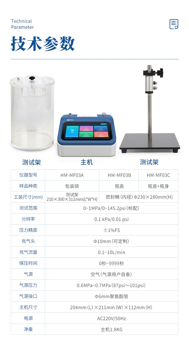 四、技术参数:型号 MF03A MF03B MF03C 样品种类 包装袋 瓶盖 瓶盖+瓶身 测试范围 0~1MPa/0~145.2 psi(标配) 分辨率 0.1 kPa/0.01 psi 压力精度 ±1%FS 充气头 Φ10 mm(可定制) 充气流量 0.1~10L/min 保压时间 0秒~9999秒 气源 空气(气源用户自备) 气源压力 0.6MPa~0.7MPa(87psi~101psi) 气源接口 Φ6 mm聚氨酯管 主机尺寸 204mm(L)×211mm(W)×112mm(H) 工装尺寸 测试架210(L)*300(W)*311(H)mm 密封桶(内径)Φ230mmX280mm(H) 密封桶(内径)Φ230mmX280mm(H) 电源 AC220V /50Hz 净重 主机1.8KG ◇ 对于用户有特殊需求的,我司在能力范围内可为用户进行定制化生产,以满足用户需求。 五、应用领域
