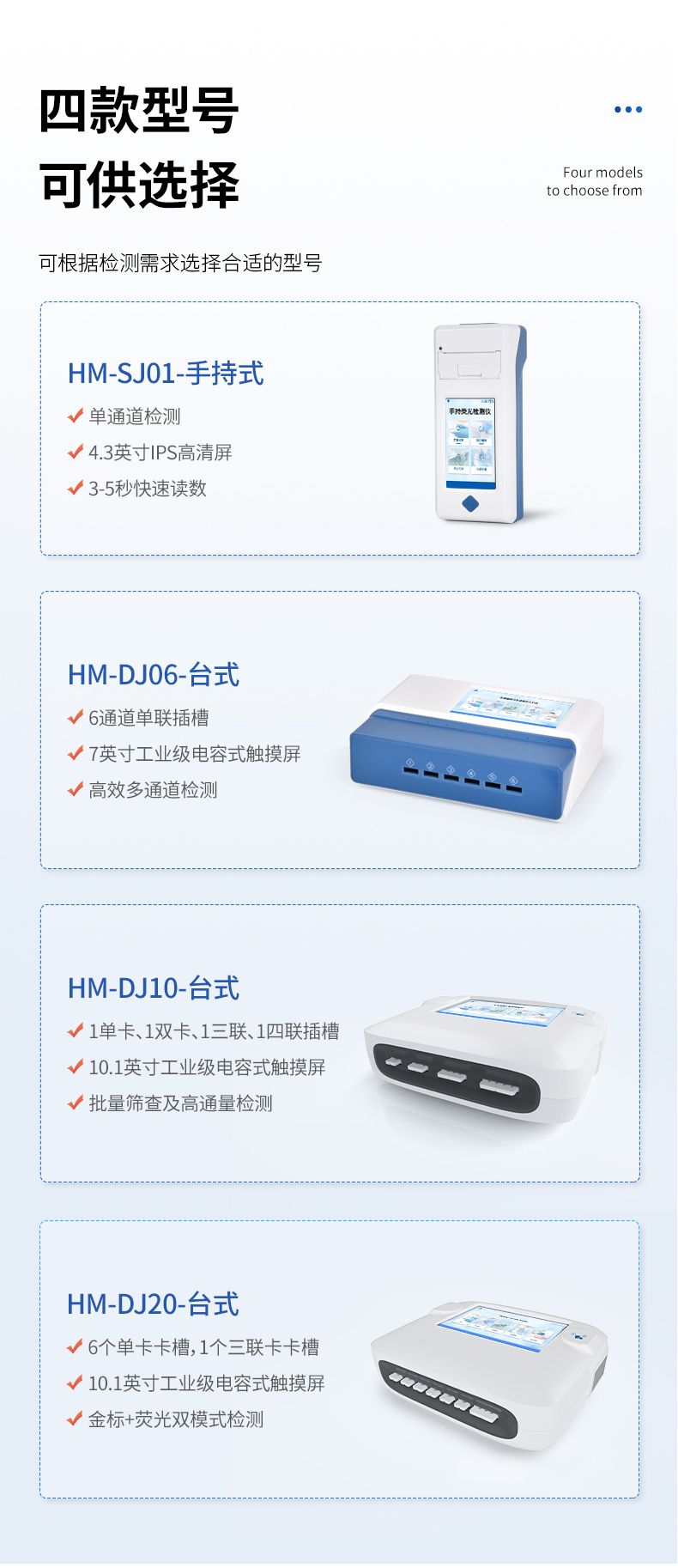 检测精度:误差值≤ 5%  检出范围:见详情  测定时间:< 5秒 (单卡及多联卡);可对样本进行胶体金定性/半定量检