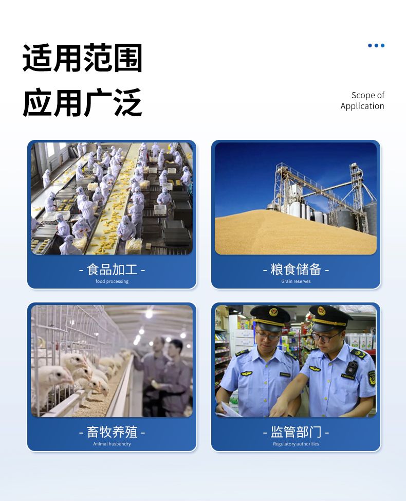 项目名称 定量范围 铅 0.025-1.0 ppm 镉 0.025-1.0 ppm 腐霉利 0.1~10 ppm 克百威 0.001~0.5ppm 毒死蜱 多菌灵 0.01~10 ppm 百菌清 0.02~10 ppm 灭蝇胺 0.01~1 ppm 三唑磷 0.05~20 ppm 辣椒素 0.2~100 ppb 黄曲霉毒素B1 2-100ppb 呕吐毒素 50-5000ppb 赭曲霉毒素A 2-500ppb 玉米赤霉烯酮 10-1000ppb 伏马毒素 50-6000ppb T-2毒素 2500ppb -