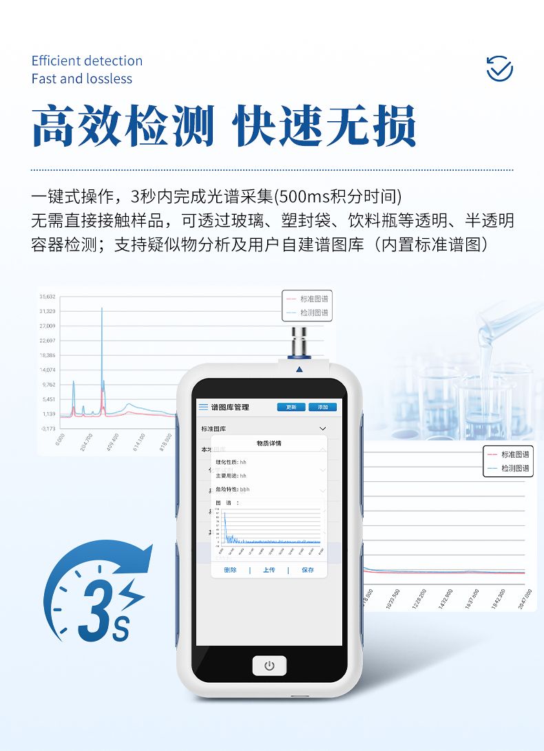 高效检测:一键式操作,3秒内完成光谱采集(500ms积分时间),无需直接接触样品,可透过玻璃、塑封袋、饮料瓶等透明、半透明容器检测;支持疑似物分析及用户自建谱图库(内置标准谱图);