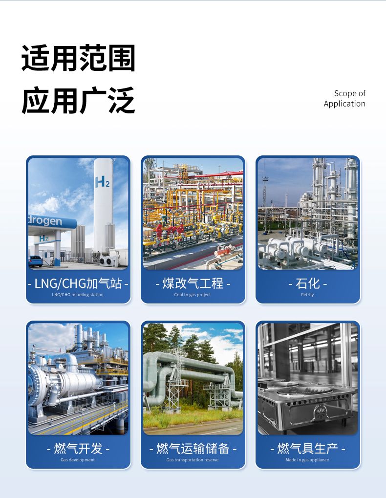 LNGCNG加气站、油田气、煤层气、矿井气、页岩气、燃气管道运输公司、燃气运输公司、燃气储备站、煤改气企业、LNG点供、燃气具生产企业、石油炼化、焦化厂、冶炼厂和供气站等众多行业。